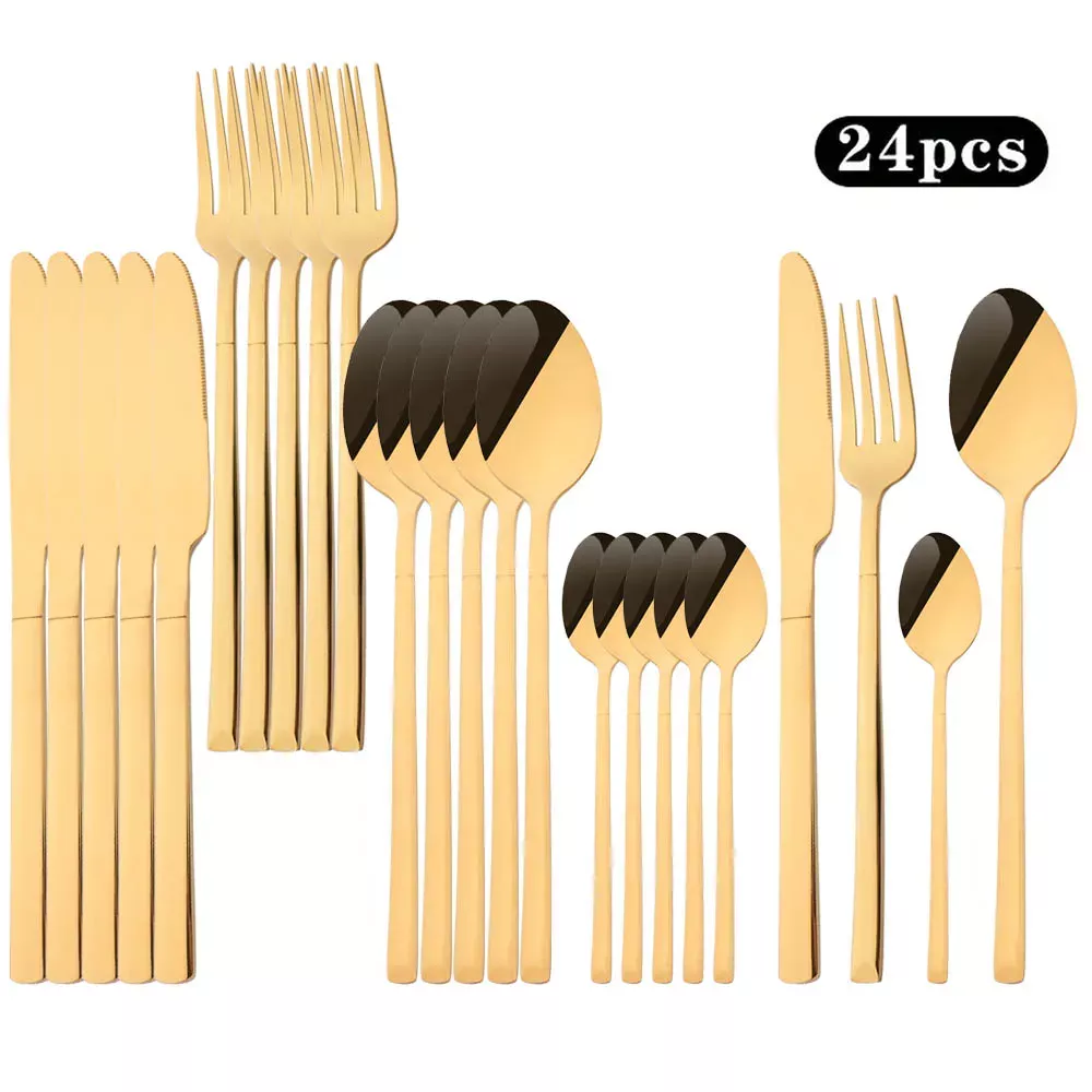 Bring sophistication and elegance to your table with the 24-Piece Gold Stainless Steel Flatware Set. Designed for both style and function, this set is a perfect addition to any home or event. Order yours now and enjoy a luxurious dining experience with every meal!