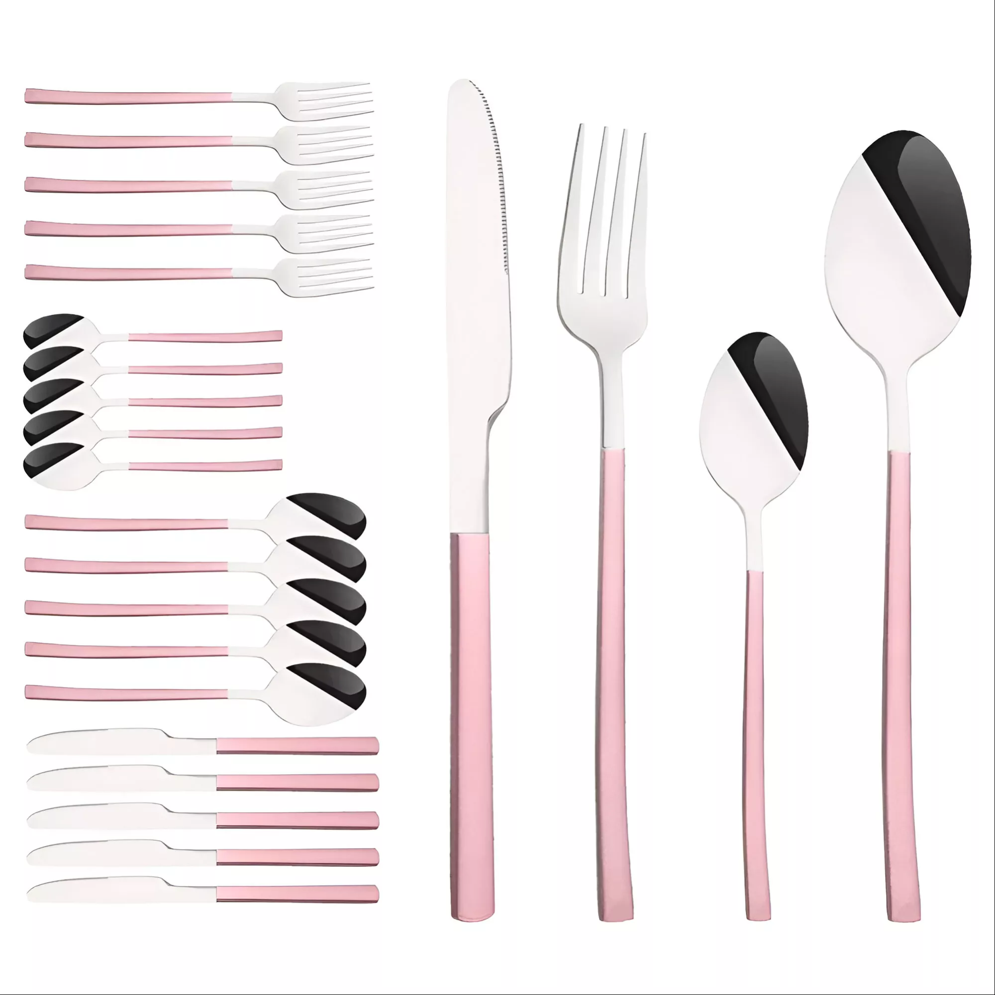Transform your dining experience with this stunning 24-piece Pink Silver Stainless Steel Flatware Set. Designed to elevate your table settings, this premium cutlery set includes everything you need for an exquisite meal: forks, knives, spoons, and coffee spoons. Whether you’re hosting a dinner party, enjoying a family meal, or serving guests at a hotel or restaurant, this flatware set adds a touch of sophistication to any occasion.