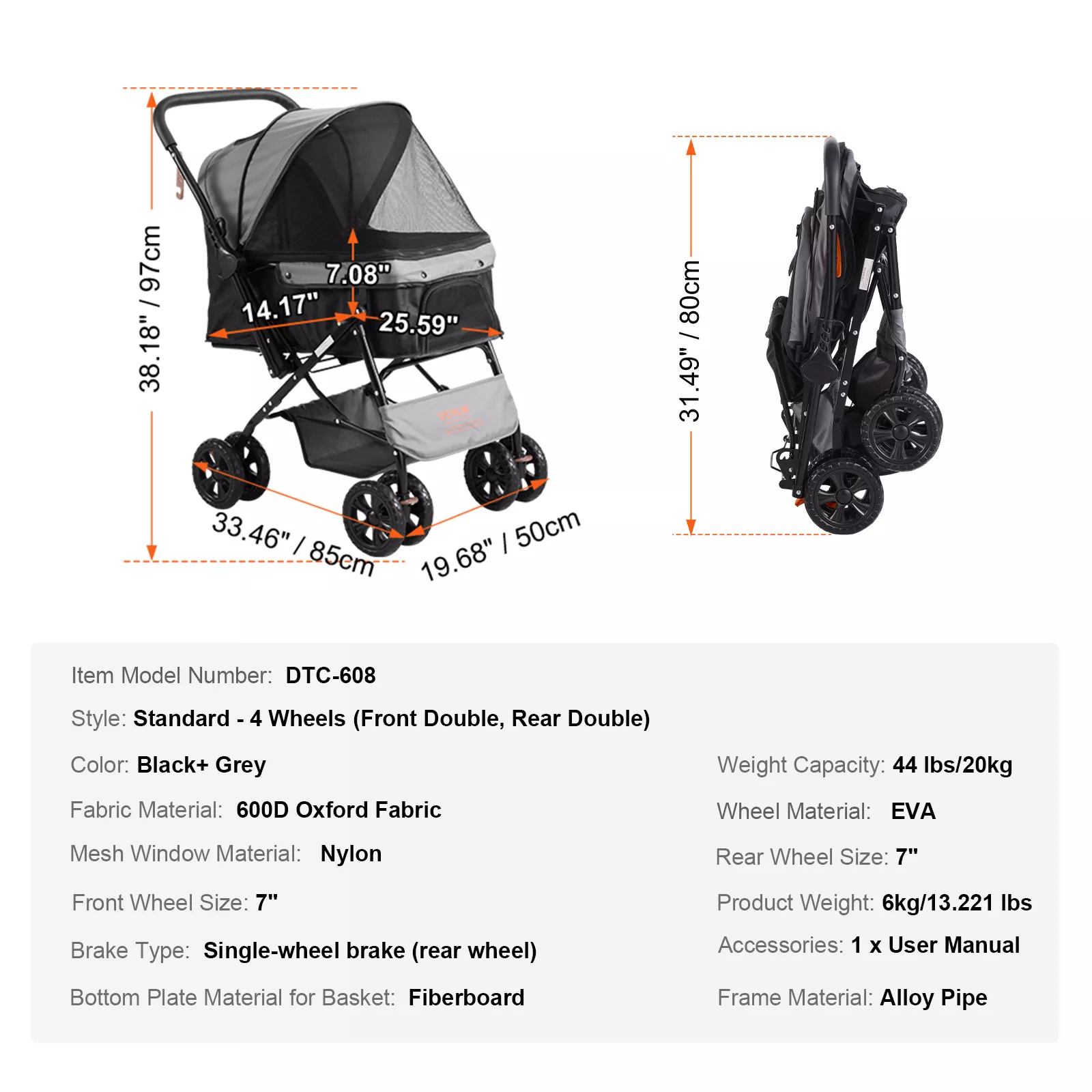 Every pet deserves to travel in style, comfort, and safety. Whether you’re taking a stroll through the park, running errands, or going on a road trip, this 4-Wheel Pet Stroller is the ideal solution for pet parents who want to ensure their furry friend enjoys every outing. Designed to accommodate pets up to 44 pounds, this sturdy stroller offers a smooth and secure ride, no matter where your adventures take you.