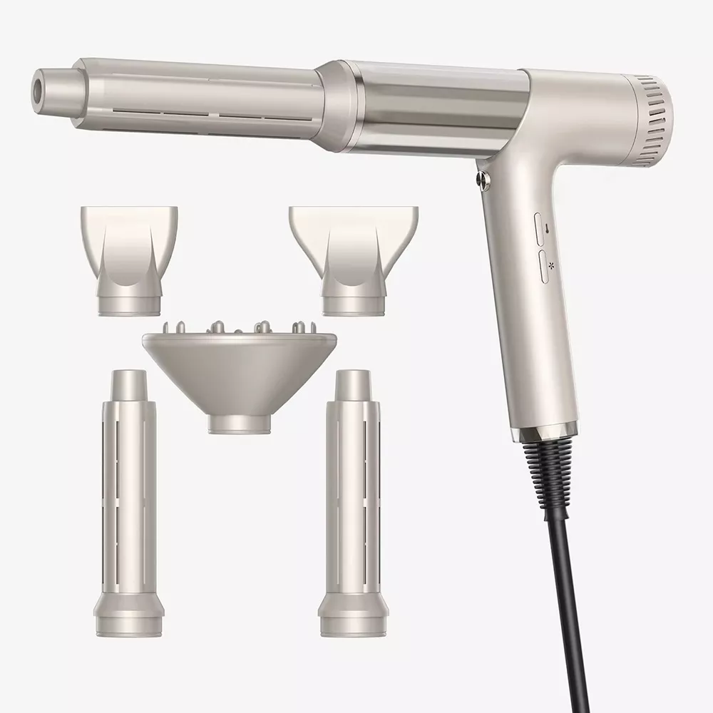 Featuring a high-speed 110,000 rpm brushless motor and 200 million negative ions, this hair dryer reduces frizz, boosts shine, and protects your hair’s natural moisture. From straight and sleek to bouncy curls or beachy waves, this dryer adapts to your needs with five unique attachments and precise heat and speed controls.