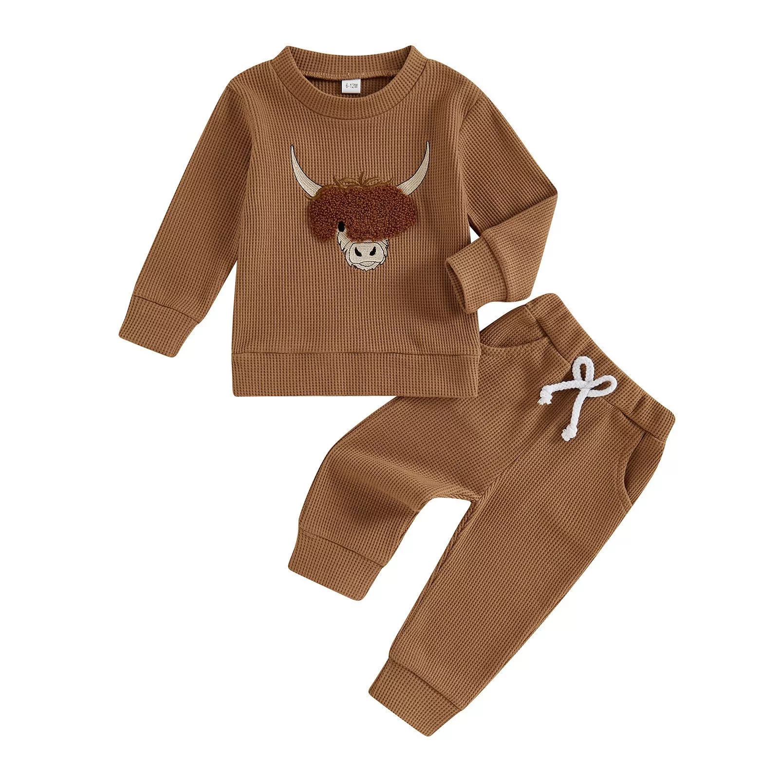 Get your little boy ready for adventure with this stylish and comfortable 2-piece waffle hoodie and pants set! Designed for active kids, this outfit blends fashion with function, keeping him cozy and stylish all season long. Featuring a soft, breathable cotton fabric and a trendy bull embroidery, this tracksuit is perfect for everyday wear, playdates, or casual outings.