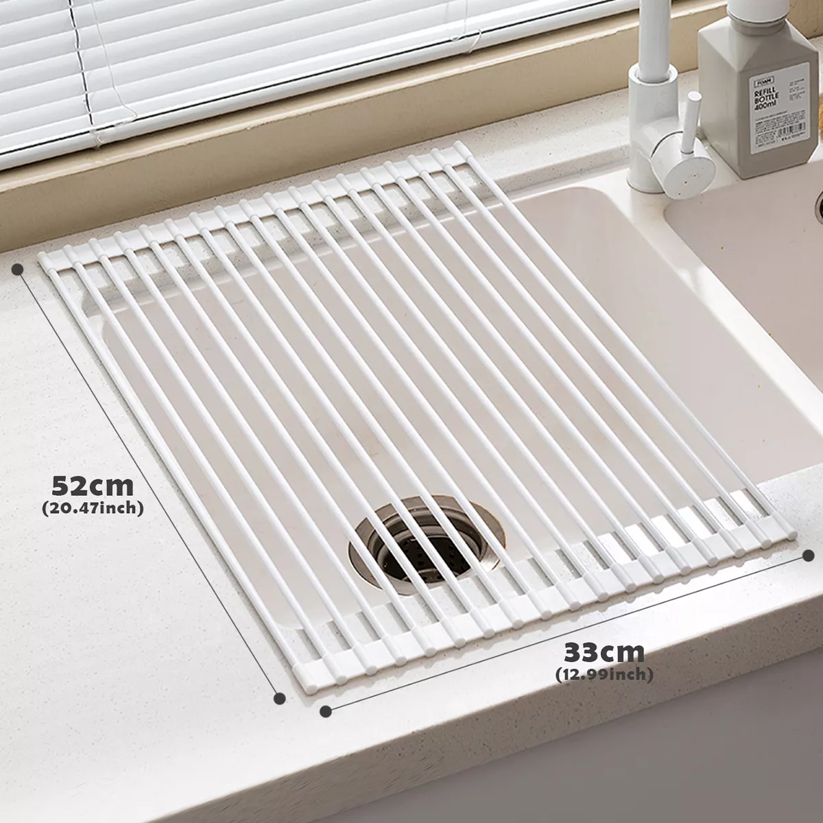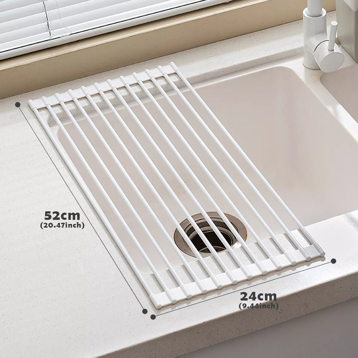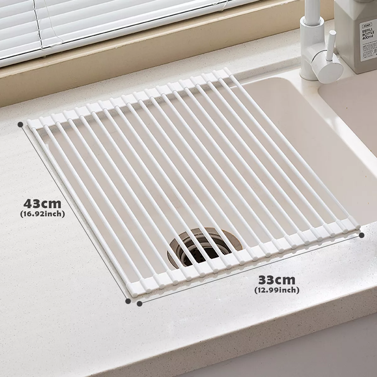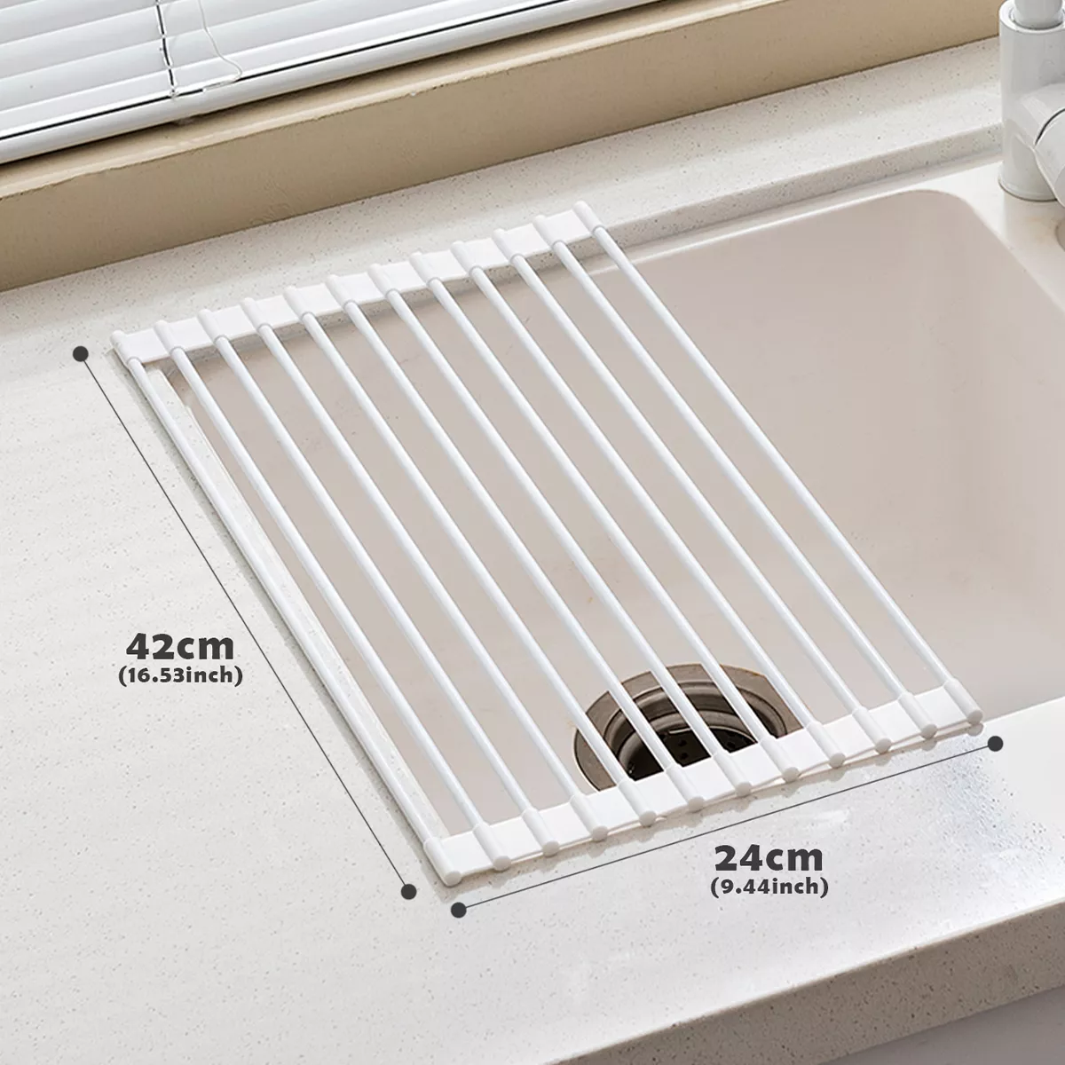Upgrade your kitchen with this foldable silicone dish drying rack, designed to save space and improve efficiency. Whether you’re drying dishes, rinsing fruits and vegetables, or using it as a heat-resistant trivet, this roll-up sink drainer is a must-have for any home. Made from durable stainless steel and silicone, it offers a sturdy and slip-resistant surface while keeping your countertop clutter-free.