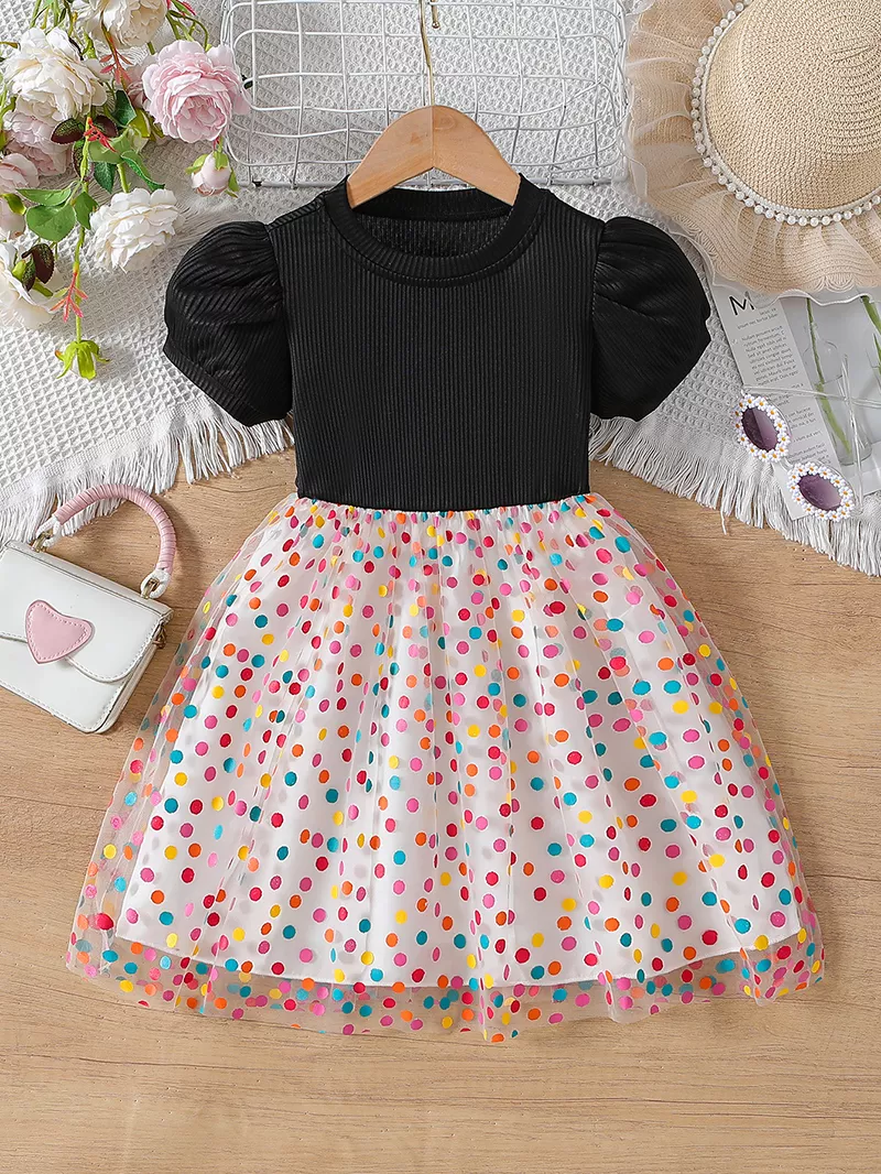 Make your little one shine this summer with this enchanting Girls’ Patchwork Mesh Princess Dress. Designed with a blend of comfort and style, this adorable dress features a charming Korean-style silhouette, playful colorful dot patterns, and a breathable short-sleeve design—perfect for warm sunny days. Whether she’s attending a birthday party, a family outing, or just twirling around at home, this dress is sure to make her feel like a true princess.